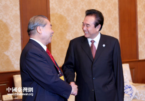全國政協(xié)常委、全國政協(xié)港澳臺僑委員會主任、海峽兩岸關系協(xié)會會長陳云林(右)會見臺灣各界知名人士訪京團。(中國臺灣網(wǎng) 張弛 攝)