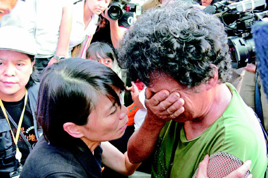馬英九夫人周美青昨天到臺(tái)東縣嘉蘭村慰問(wèn)災(zāi)民,失去家園的婦人見(jiàn)到她痛哭失聲,周美青半跪著緊擁婦人,輕聲安慰:“人在就好!我們還有希望。”圖片來(lái)源:臺(tái)灣《聯(lián)合報(bào)》