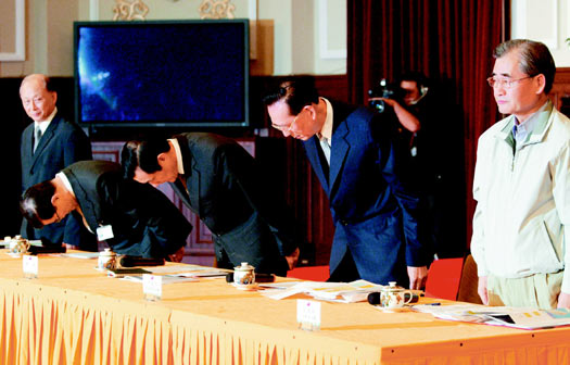 馬英九(右三)昨天率臺(tái)當(dāng)局“首長(zhǎng)”在記者會(huì)上道歉。他與蕭萬(wàn)長(zhǎng)(左二)、“行政院副院長(zhǎng)”邱正雄(右二)鞠躬后定住7秒鐘,一時(shí)不察的“國(guó)防部長(zhǎng)”陳肇敏(左一)、“交通部長(zhǎng)”毛治國(guó)(右一)卻已先起身。圖片來(lái)源:臺(tái)灣《聯(lián)合報(bào)》