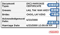 劉德華與朱麗倩(本名朱麗卿)在美國(guó)賭城結(jié)婚注冊(cè)的結(jié)婚認(rèn)證曝光,結(jié)婚日期是2008年6月23日。來(lái)源:臺(tái)灣《蘋果日?qǐng)?bào)》