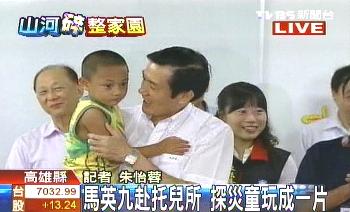 馬英九今天南下高雄縣,探訪遷移到陸軍官校營區(qū)的一千多名災(zāi)民,并與小朋友們親熱互動(dòng)。來源:臺(tái)灣TVBS電視臺(tái)