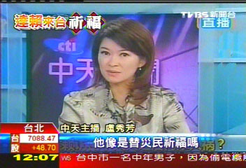 8月31日晚間9點(diǎn)半,臺(tái)灣中天新聞臺(tái)主播盧秀芳在與大陸電視臺(tái)連線討論達(dá)賴赴臺(tái)話題時(shí),引述記者的報(bào)道表示,達(dá)賴去災(zāi)區(qū)根本沒通知災(zāi)民,干脆不要來。