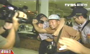 達(dá)賴今日結(jié)束5天行程返回印度,在其下榻的福華飯店,一大清早就有示威民眾激動抗議,還與警方發(fā)生拉扯,表達(dá)對達(dá)賴此行的強(qiáng)烈不滿。圖片來源:臺灣TVBS電視臺