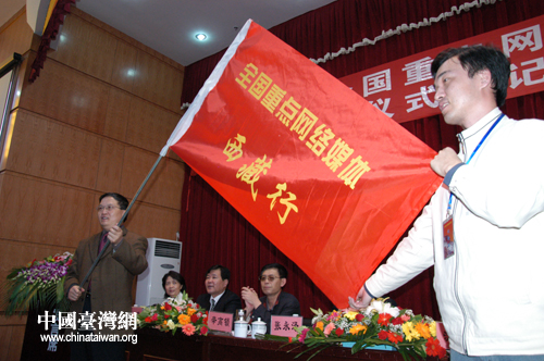 西藏自治區(qū)黨委宣傳部常務(wù)副部長沈開運(yùn)向全國重點(diǎn)網(wǎng)絡(luò)媒體代表授旗(中國臺灣網(wǎng) 李典典 攝)