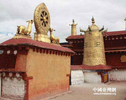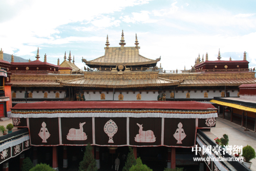 大昭寺頂上金碧輝煌的法輪與經(jīng)幢是大昭寺的主要標志之一。(中國臺灣網(wǎng) 李典典 攝)
