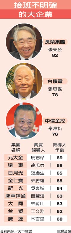 臺(tái)灣前30大企業(yè)中,有12家企業(yè)領(lǐng)導(dǎo)人超過60歲,其中3家超過70歲,例如臺(tái)積電張忠謀、中信金辜濂松、長(zhǎng)榮集團(tuán)張榮發(fā)等。