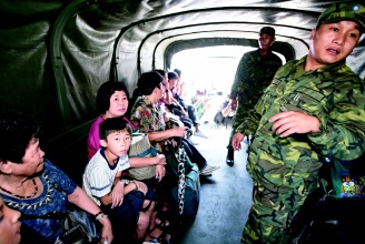 “芭瑪”臺(tái)風(fēng)威脅下,高雄縣六龜鄉(xiāng)寶來(lái)村民昨天全部撤離,老老少少搭乘軍車(chē)下山。來(lái)源:臺(tái)灣《聯(lián)合報(bào)》