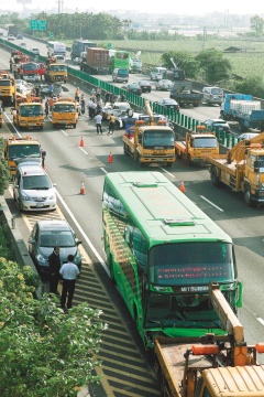 一輛統(tǒng)聯(lián)客運(yùn)客車(前)昨天上午在中山高北上彰化路段追撞10余輛小客車,造成4死8傷,現(xiàn)場一片狼藉,大批警察及拖救車直至下午3時(shí)許仍在現(xiàn)場善后。