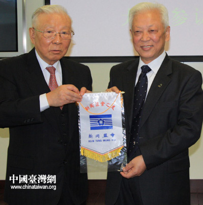 民革中央主席周鐵農(nóng)(右)與臺(tái)灣新同盟會(huì)會(huì)長(zhǎng)許歷農(nóng)(左)互贈(zèng)禮物。(中國(guó)臺(tái)灣網(wǎng) 高斯斯 攝)