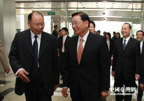 中國臺灣網(wǎng)10月29日北京消息 29日,臺灣;鶗麻L江丙坤率領(lǐng)的海基會新聞交流團一行訪問人民日報社。這是人民日報社社長張研農(nóng)迎接江丙坤一行的到來。(中國臺灣網(wǎng) 田云鵬 攝)