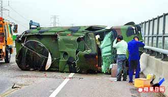 臺(tái)軍用天頻車傾覆,駕駛兵(右一)及隨車士官長(zhǎng)(右二)自行爬出車外。 來源:臺(tái)灣《蘋果日?qǐng)?bào)》