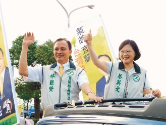 民進(jìn)黨籍宜蘭縣長(zhǎng)候選人林聰賢(左)昨天挨告,仍在民進(jìn)黨主席蔡英文(右)陪同下掃街拜票。來(lái)源:臺(tái)灣《聯(lián)合報(bào)》