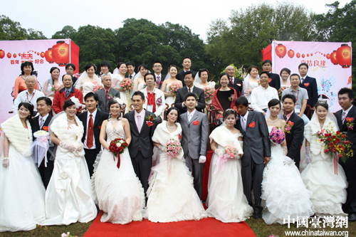 集體婚禮于上午近10點開始,來自廈門的8對新人早早化好妝,并提早出發(fā)集體前往金門的太湖候場。金門的8對新人則是分頭趕赴現(xiàn)場,兩岸新人互相打著招呼。吉時將近,高頭大馬和花轎開頭,16對新人攜手沿著太湖邊上張燈結(jié)彩的“幸福大道”,在祝福聲及閃光燈中,步行前往婚禮主會場榕園。