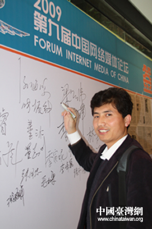 第九屆中國(guó)網(wǎng)絡(luò)媒體論壇將于明天開幕,圖為參會(huì)嘉賓在簽名版前簽名留念。(中國(guó)臺(tái)灣網(wǎng) 陳寧 攝)