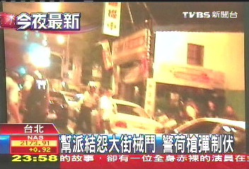 據(jù)臺(tái)灣TVBS電視臺(tái)報(bào)道,深夜11點(diǎn)多,五六十名竹聯(lián)幫忠堂和其他幫派分子,站在車水馬龍的大馬路上,互相叫囂。大批人馬堵在酒店大門口前,不時(shí)挑釁、示威,盡管增援的警車一輛輛趕到,趕來的警察也荷槍實(shí)彈現(xiàn)場(chǎng)戒護(hù),但是兩派人馬都沒有散去的意思,不斷在警察面前咆哮。