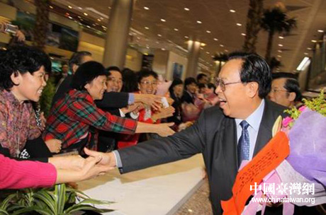 “中原文化寶島行”代表團(tuán)抵達(dá)臺(tái)北桃園機(jī)場(chǎng),島內(nèi)民眾自發(fā)到機(jī)場(chǎng)迎接,圖為徐光春向前來(lái)歡迎的民眾揮手致意。圖片來(lái)源:河南省臺(tái)辦
