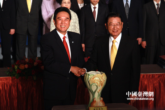 中國臺灣網(wǎng)12月22日臺中消息 22日下午,臺灣;鶗麻L江丙坤向海協(xié)會會長陳云林贈送法蘭瓷器《安和升祥》。當(dāng)天下午,兩岸兩會領(lǐng)導(dǎo)人在臺中市簽署了《海峽兩岸漁船船員勞務(wù)合作協(xié)議》等三項協(xié)議。(中國臺灣網(wǎng) 李徽 攝)