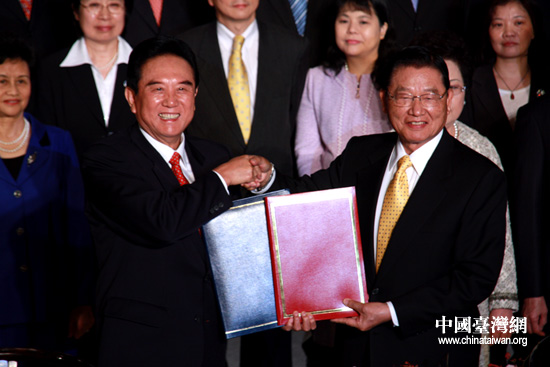 中國臺灣網(wǎng)12月22日臺中消息 22日下午,海協(xié)會會長陳云林與臺灣海基會董事長江丙坤在臺中市簽署《海峽兩岸漁船船員勞務(wù)合作協(xié)議》、《海峽兩岸農(nóng)產(chǎn)品檢驗(yàn)檢疫合作協(xié)議》、《海峽兩岸標(biāo)準(zhǔn)計(jì)量檢驗(yàn)認(rèn)證合作協(xié)議》等三項(xiàng)協(xié)議。圖為陳云林與江丙坤交換協(xié)議文本。(中國臺灣網(wǎng) 李徽 攝)