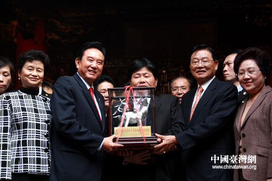 臺灣大甲鎮(zhèn)瀾宮院長顏清標(biāo)向陳云林贈(zèng)送錫雕《福祿壽喜》。 (中國臺灣網(wǎng) 李徽 攝)