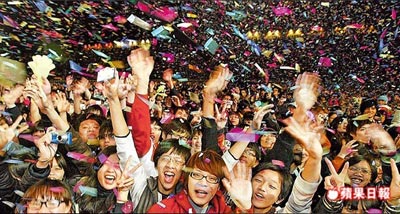 臺(tái)中市跨年晚會(huì)倒數(shù)結(jié)束后,撒下慶祝新年的紙花,民眾興奮不已。來源:臺(tái)灣《蘋果日?qǐng)?bào)》