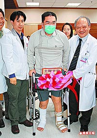 中國臺(tái)灣網(wǎng)1月27日消息 據(jù)臺(tái)灣《蘋果日報(bào)》報(bào)道,造紙廠工人吳梓豪(30歲)去年工作時(shí),不慎被機(jī)器截?cái)嚯p腳,送到嘉義基督教醫(yī)院急救,醫(yī)院動(dòng)員5名醫(yī)師花了12小時(shí)縫合,經(jīng)過4個(gè)月復(fù)健,吳目前已可用輔助器站立。昨天醫(yī)院為他慶生,他高興說:“站起來的感覺真好,希望以后可騎自行車環(huán)島!