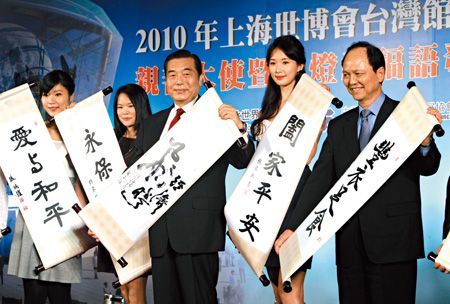 上海世博會(huì)臺(tái)灣館親善大使28日由臺(tái)灣館代言人藝人林志玲(右2)率領(lǐng)公開(kāi)亮相,并與臺(tái)北世貿(mào)中心董事長(zhǎng)王志剛(中)、副董事長(zhǎng)吳文雅(右)出席。來(lái)源:臺(tái)灣《旺報(bào)》