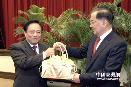 連戰(zhàn)向梁國揚(yáng)贈(zèng)送臺(tái)灣特產(chǎn)茶葉。(中國臺(tái)灣網(wǎng) 田云鵬 攝)