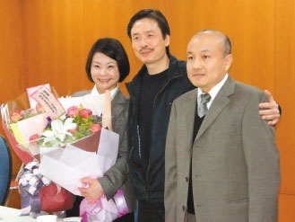 國(guó)民黨秘書長(zhǎng)金溥聰(中)昨日到新竹縣,宣布議長(zhǎng)張碧琴和縣長(zhǎng)邱鏡淳同意撤回縣長(zhǎng)選舉期間官司,邱縣長(zhǎng)不克出席,由機(jī)要秘書張德清代為出席。圖片來(lái)源:臺(tái)灣《聯(lián)合報(bào)》