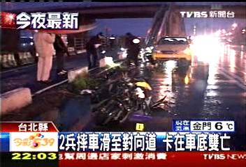 中國臺灣網(wǎng)2月19日消息 臺北縣昨晚發(fā)生一起死亡車禍,2名現(xiàn)役臺憲兵,騎摩托車經(jīng)過新莊新海橋下堤外便道的時候,可能因為天雨路滑,連人帶車摔到對向車道,卡在計程車底,強大的撞擊力道,讓2個人在送醫(yī)后還是不治身亡。