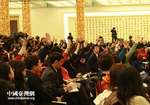 2日下午,全國政協(xié)十一屆三次會議召開首場新聞發(fā)布會。圖為發(fā)布會現(xiàn)場記者踴躍發(fā)言提問。(中國臺灣網(wǎng) 張弛 攝)