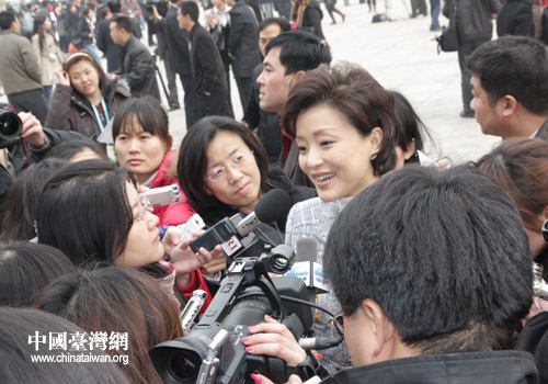 楊瀾剛走進人民大會堂廣場就被記者們團團圍住,作為資深媒體人,她認為資訊沒有邊界,跨越地域和媒介會成為媒體將來的發(fā)展趨勢。(中國臺灣網(wǎng) 高斯斯 攝)