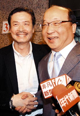 臺(tái)中市長(zhǎng)胡志強(qiáng)(右)昨天前往國(guó)民黨中央黨部拜訪秘書長(zhǎng)金溥聰(左),表達(dá)參選大臺(tái)中市長(zhǎng)是他最愛的選擇,也是唯一的志愿。來源:臺(tái)灣《聯(lián)合報(bào)》