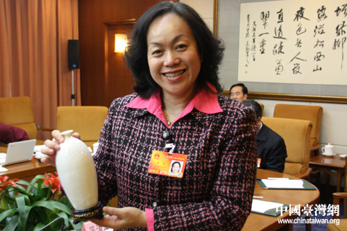 圖為臺(tái)籍女代表陳軍向記者展示精美的節(jié)日禮物。 (中國臺(tái)灣網(wǎng) 徐維彬 攝)
