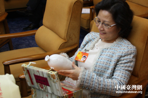 圖為臺(tái)籍女代表陳云英對(duì)節(jié)日禮物愛不釋手 (中國臺(tái)灣網(wǎng) 徐維彬 攝)
