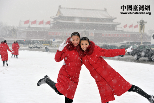 禮儀小姐興奮的映雪起舞!。ㄖ袊_灣網(wǎng)發(fā) 肖春陽、劉洋攝)