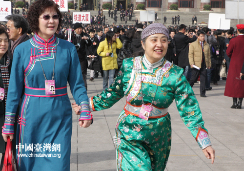 政協(xié)委員們今天盛裝出席閉幕會,少數(shù)民族委員穿上了民族服裝吸引鏡頭,宋祖英等解放軍界別委員一身戎裝分外精神,姜昆系上了紅領帶,女委員們也不約而同的身著紅衣,與天安門廣場上迎風招展的國旗交相輝映,仿佛預示著2010年,中國——“紅”。(記者 張弛 高斯斯)