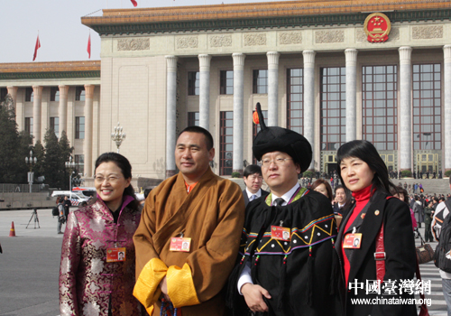 13日上午,全國(guó)政協(xié)十一屆三次會(huì)議勝利閉幕。這是委員們?cè)谌嗣翊髸?huì)堂前合影留念。(中國(guó)臺(tái)灣網(wǎng) 張弛 攝)