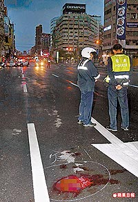 事故現(xiàn)場留下大灘血跡,但沒有監(jiān)視器錄下經(jīng)過與肇事逃逸車輛信息。圖片來源:臺灣《蘋果日報》