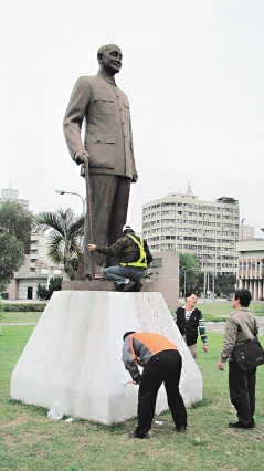 臺(tái)中市學(xué)士路中正公園內(nèi)的蔣介石銅像,昨天凌晨被不明人士潑灑紅漆。