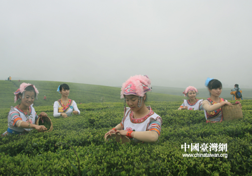 漫山遍野的茶樹翠色欲滴,美麗的采茶姑娘穿梭于茶樹之間,纖手拈芽,不亦樂乎。(中國臺灣網(wǎng) 李丹 攝)