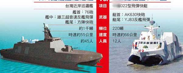 據(jù)不愿透露姓名的臺當(dāng)局“國防部”主管作戰(zhàn)官員表示,雄三導(dǎo)彈射程三百公里,臺灣海峽僅兩百至三百公里寬,未來此型近岸巡邏艦只要部署在海峽附近巡弋,即可達(dá)到封鎖臺灣海峽的戰(zhàn)略嚇阻作用。該艦噸位數(shù)約一千噸,戰(zhàn)時可在一般漁港進(jìn)行躲避及補(bǔ)給作業(yè),在戰(zhàn)場的生存率上,比拉法葉艦、成功級艦等大型艦更具優(yōu)勢。