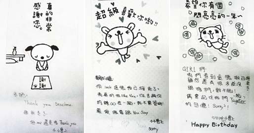 左:給老師和同學曹姓女童寫給老師的遺書,告訴老師“謝謝你”。中:女童遺書還寫給自己最喜歡的班上男生,說不在意他去找陳某某,而且還是很愛著他。右:寫給同班“GIRL們”的卡片,告訴好姊妹當她們看到這張卡片時,“我已經(jīng)走了”。圖片來源:臺灣《聯(lián)合報》
