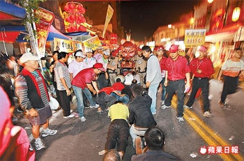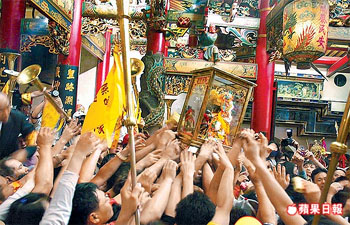大甲鎮(zhèn)瀾宮媽祖進廟時信眾搶摸媽祖本尊希望得到好運。來源:臺灣《蘋果日報》