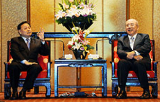 吳伯雄會(huì)見(jiàn)湖北省委書(shū)記羅清泉,表達(dá)了對(duì)青海震災(zāi)的關(guān)心。圖片來(lái)源:臺(tái)灣“中央社”