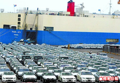 載運(yùn)906輛歐系高級(jí)車(chē)的希珍號(hào)汽車(chē)輪,昨早7時(shí)30分抵臺(tái)中港,包括417輛奔馳,483輛寶馬與MINI Cooper,6輛保時(shí)捷名車(chē)。臺(tái)中縣報(bào)關(guān)商業(yè)同業(yè)公會(huì)理事長(zhǎng)林阿堅(jiān)說(shuō):“這批車(chē)子僅進(jìn)口關(guān)稅,估算就要50億元。”