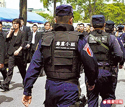 臺警方小組持槍在現(xiàn)場巡邏,并加強盤查青少年。 來源:臺灣《蘋果日報》