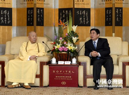 中國臺灣網(wǎng)5月6日西安消息 5月4日下午陜西省省長袁純清在西安會見了由惟覺長老率領(lǐng)的中臺禪寺參訪團一行。