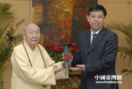 會見后,閆超英向惟覺長老贈送了代表陜西特色的禮品“華縣皮影”,惟覺長老回贈了中臺禪寺的“鎮(zhèn)寺之寶”辟邪半圓水晶模型。(中國臺灣網(wǎng) 陜西省臺辦 聯(lián)合報道)