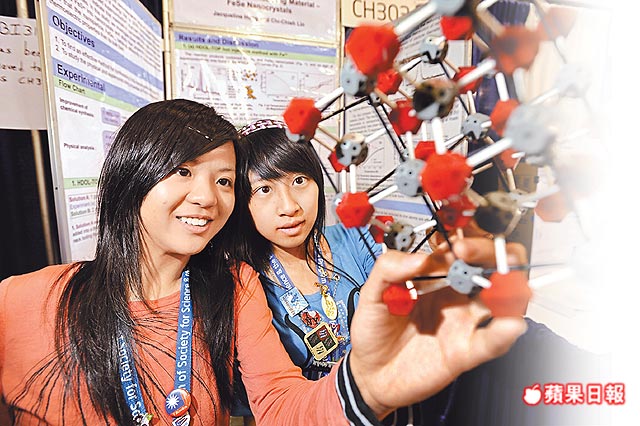 臺北女學生洪瑀(右)及林季潔(左)榮獲英特爾國際科學展大會化學科一等獎。圖片來源:臺灣《蘋果日報》