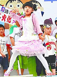 游行現(xiàn)場邀學(xué)童上臺表演舞蹈,訴求不要加重學(xué)習(xí)壓力、希望有快樂童年。圖片來源:臺灣《蘋果日報(bào)》
